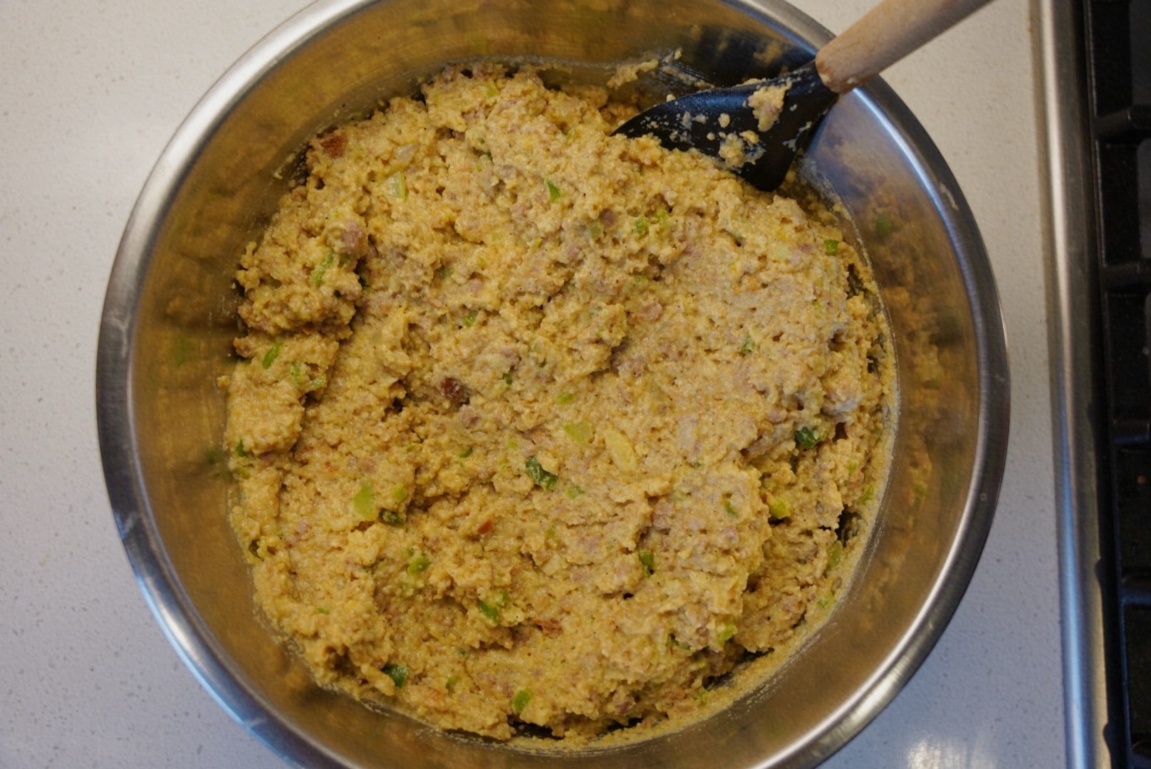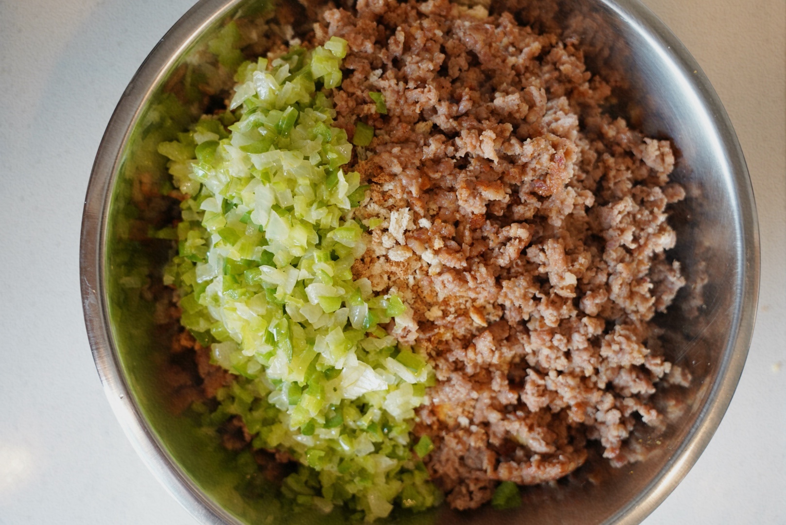 - Mix the Base: In a large bowl, combine cornbread crumbles, sausage, sautéed veggies, and stuffing mix.